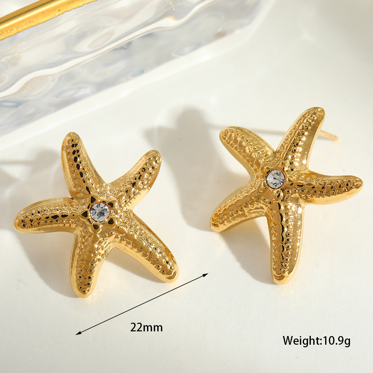 Shiny gold starfish earrings with textured detailing and a single crystal center — a chic, beach-inspired accessory with a touch of elegance.