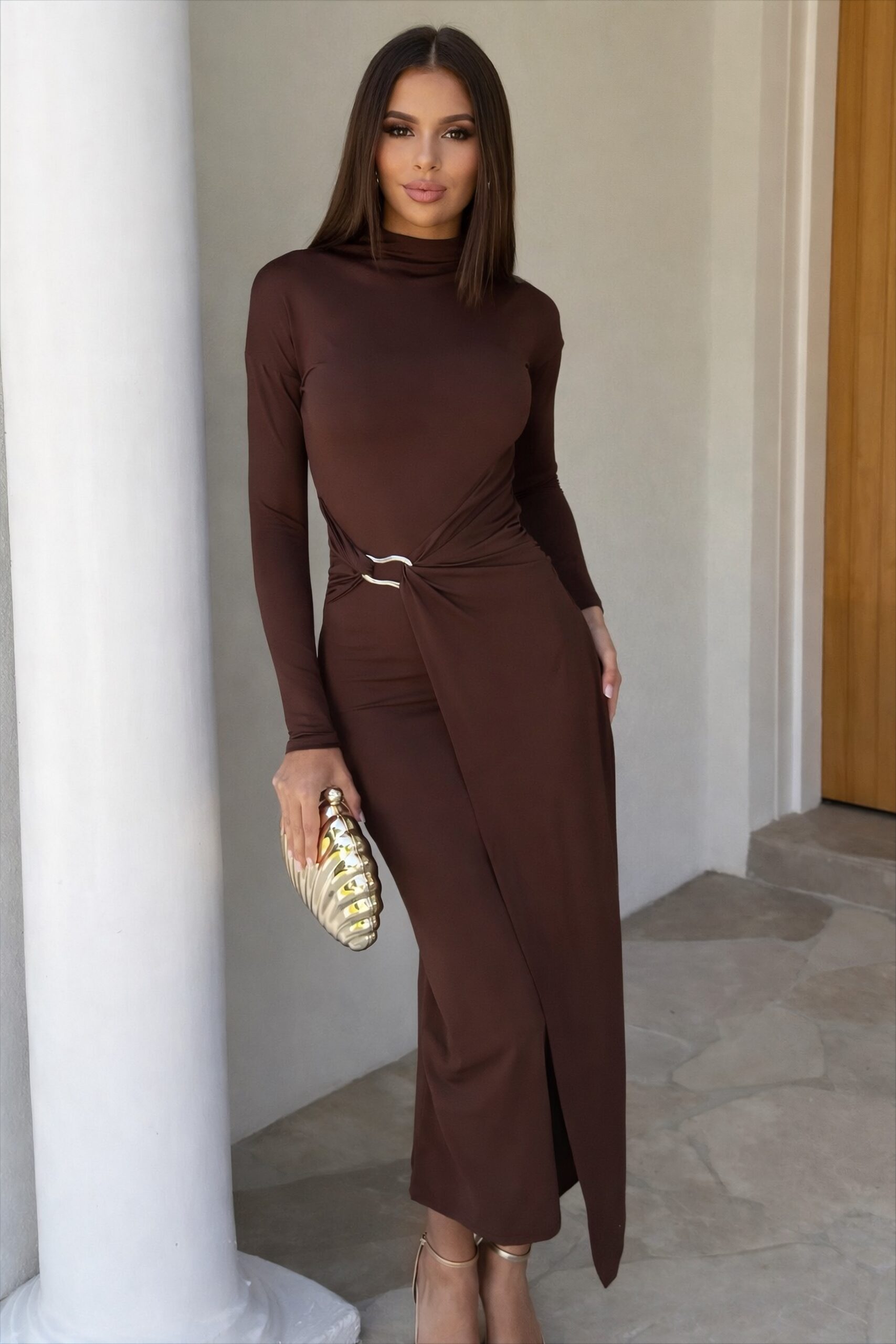 Sophisticated with a sensual edge, the Mocha Muse Draped Maxi Dress is designed to contour the body beautifully. Crafted in a smooth stretch fabric, this dress features an elegant high neckline, long sleeves, and a signature waist-draped detail accented with a subtle metallic clasp. The rich mocha tone adds warmth and luxury, making it perfect for evenings, formal occasions, and statement moments.