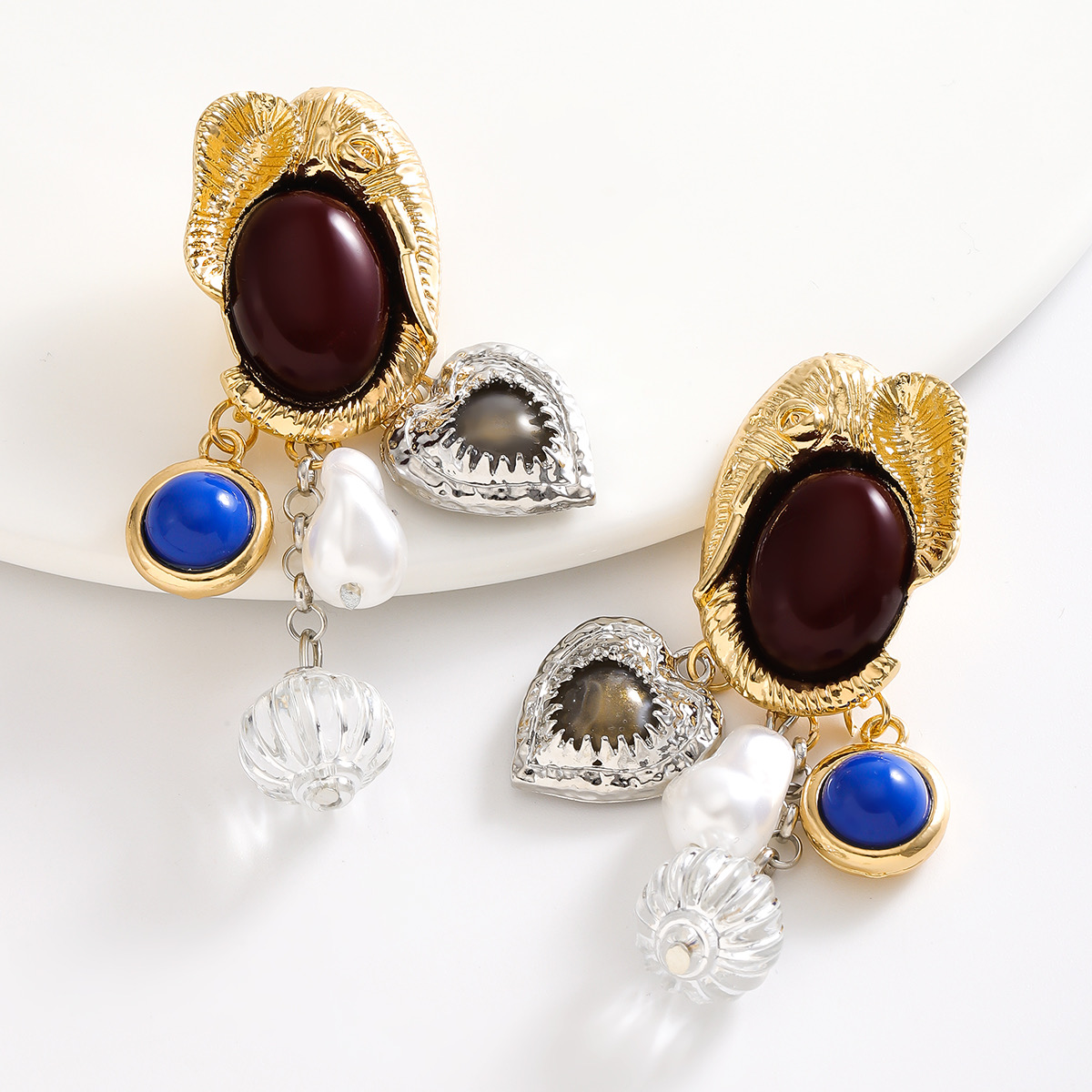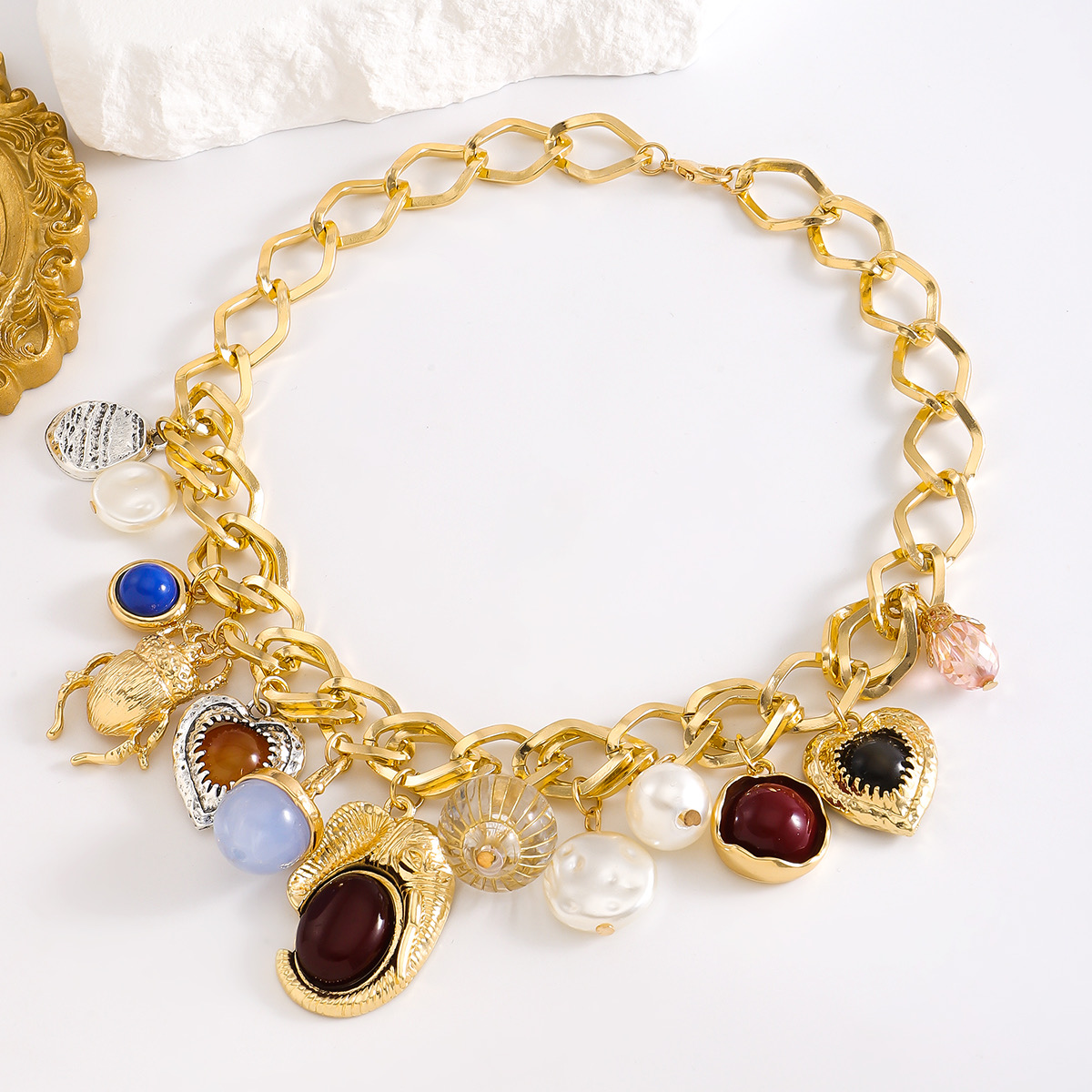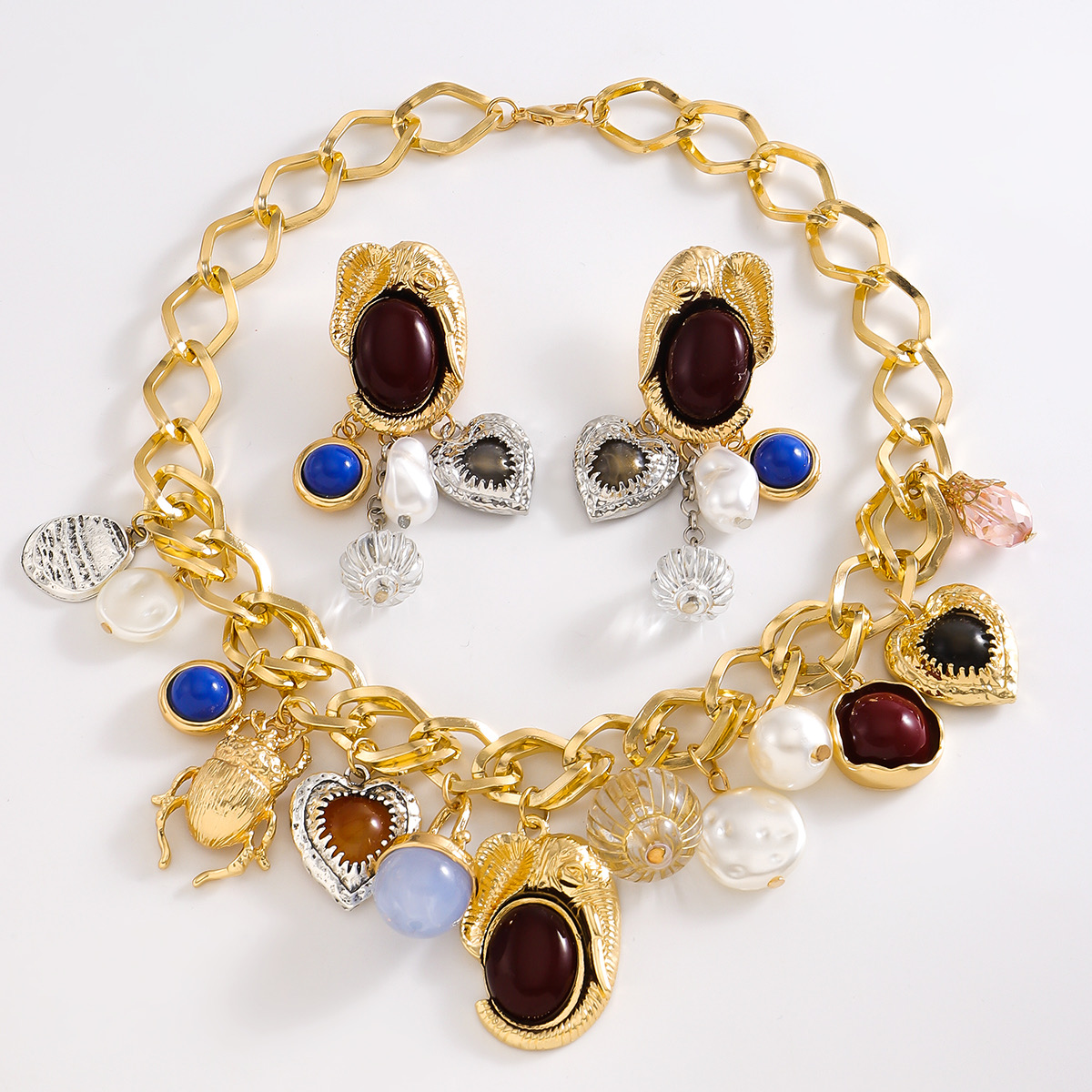 Crafted in a bold vintage-inspired design, this necklace set blends artistic detailing, sculptural elements, and rich textures to create a look that feels like a modern heirloom. Every charm is thoughtfully composed using resin accents, heart motifs, insect-inspired details, and pearl-like elements, giving the piece depth, movement, and character.
